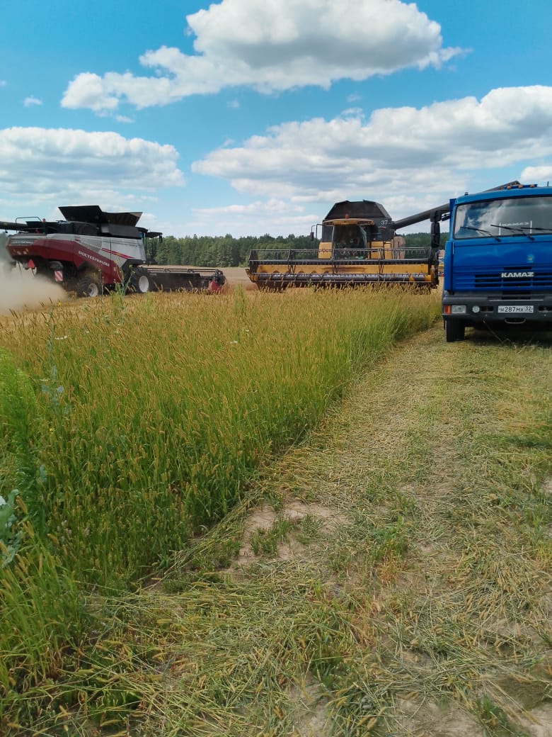 В Навлинском районе на полях ООО «Экопродукт» ведется уборка озимой пшеницы. Площадь под посевами занимает 264 гектара. Урожайность хорошая. На поле работает два комбайна. Собранное зерно сразу загружают на КаМазы и доставляют на склады.