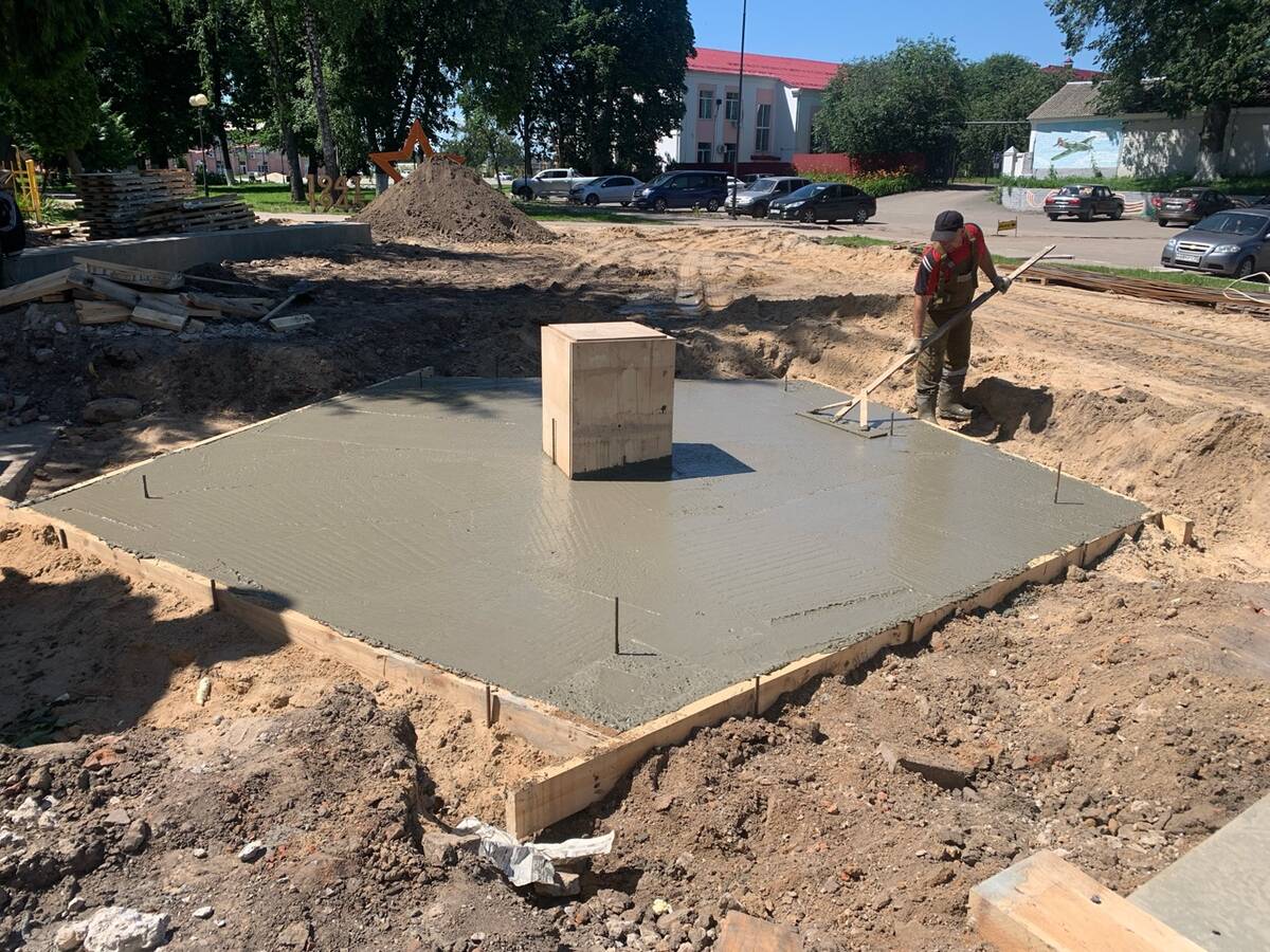 В Стародубе в сквере имени 348-й стрелковой дивизии идет реконструкция мемориального комплекса. Специалисты подрядной организации ООО «Стройтрейд» произвели демонтаж старой конструкции. Сейчас они заливают бетонное основание под Вечный огонь, после чего приступят к монтажу металлокаркаса для обновлённой «Стены Памяти». Полукруглую стену украсят гранитные плиты с именами погибших земляков.