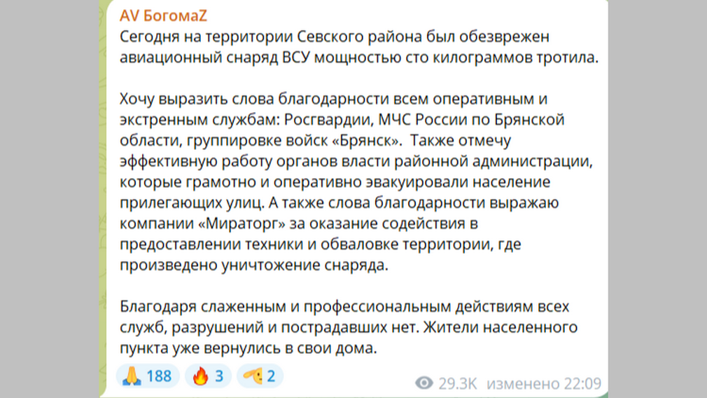 Глава региона поблагодарил все оперативные и экстренные службы, отметил эффективную работу органов власти Севской районной администрации по грамотной и оперативной эвакуации населения. Компании «Мираторг» Александр Богомаз выразил благодарность за предоставление техники и обваловку территории, где уничтожили снаряд. Отмечено, что благодаря профессионализму всех служб жертв и разрушений нет. Жители вернулись в свои дома.
