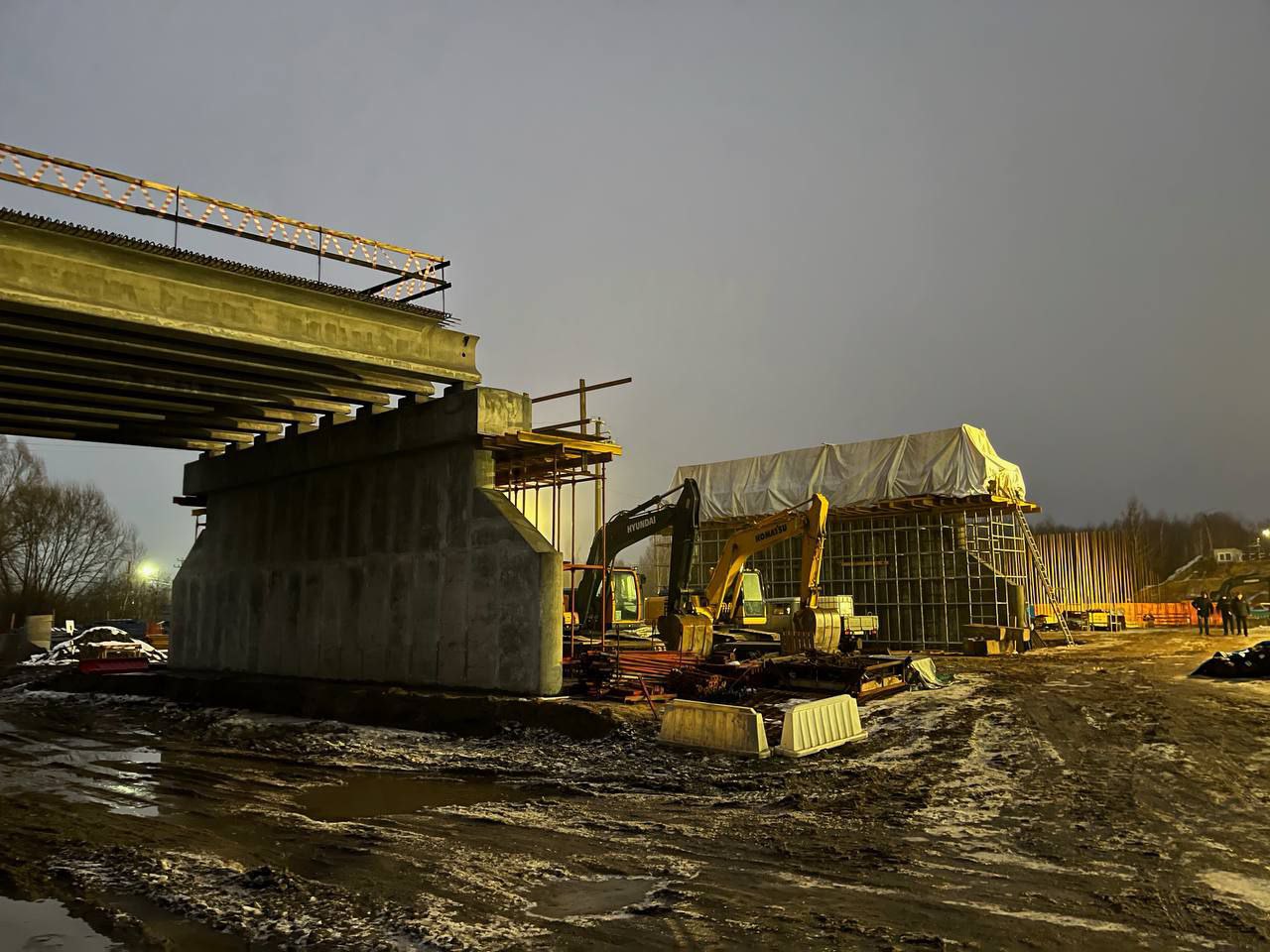 Подрядчик вкладывается в график, работы ведутся в хорошем темпе, не остановятся и в праздничные и выходные дни. Старый мост демонтирован, возведены четыре новые опоры из восьми, смонтировано два пролета и сделан временный технический переезд.