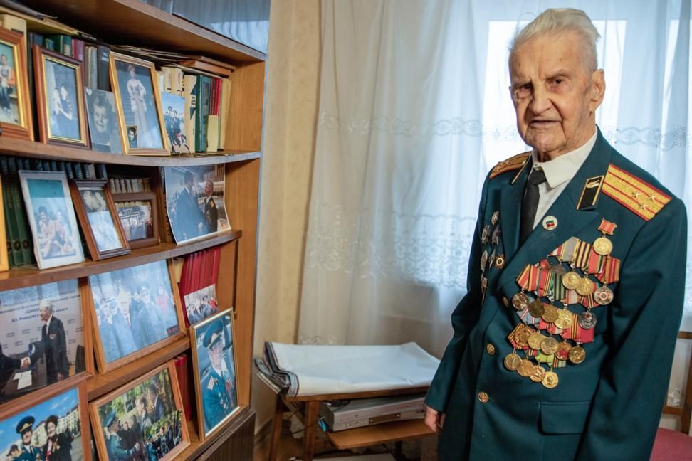 В прихожей висит большой баннер, на котором ветеран со своей супругой запечатлены в один из Дней Победы, в гостиной множество фотографий разных лет, газеты и журналы с многочисленными интервью. На снимках он с президентом, членами правительства, патриархом, губернатором Брянской области, другими известными людьми.