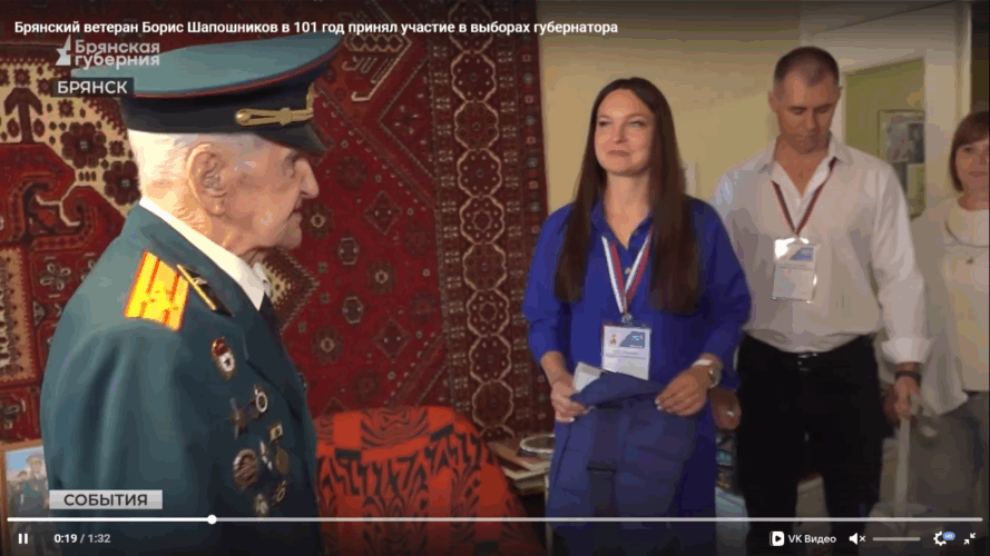 К 101-летнему ветерану Великой Отечественной войны Борису Шапошникову члены брянской участковой комиссии приехали с ящиком для голосования на дом . Он встречает гостей при параде – в военной форме, в фуражке, на кителе — ордена и медали.