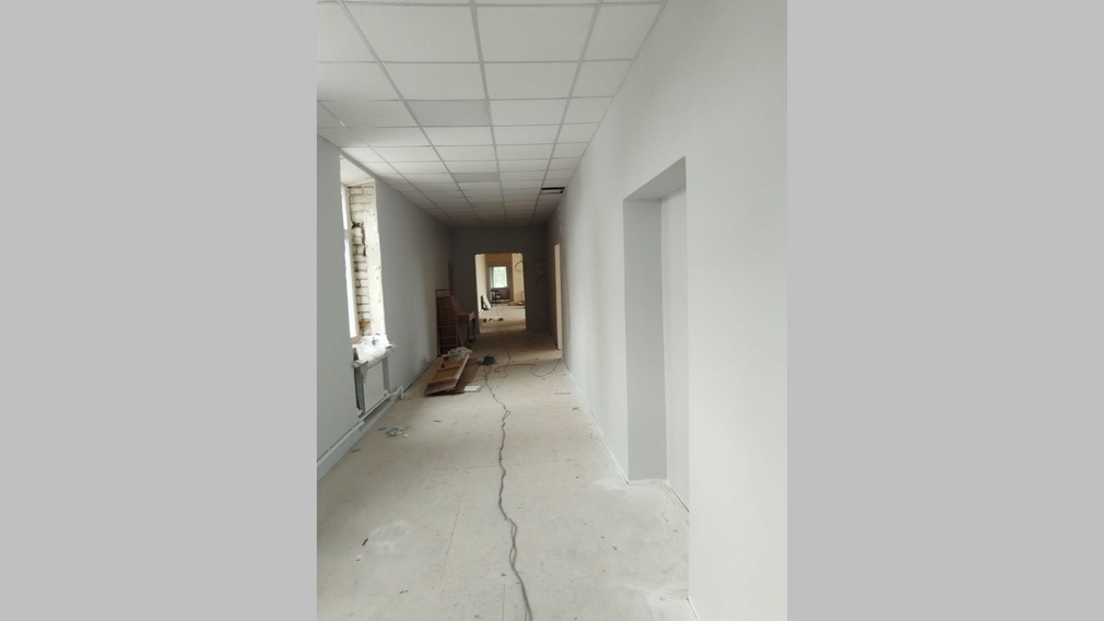 В настоящее время бригада из 25 человек завершает работы по монтажу отопительной системы, продолжается установка видеонаблюдения, пожарной сигнализации, навесных потолков и штукатурка фасада. Уже выполнено устройство чернового пола в спортивном зале и монтаж водосточной системы.