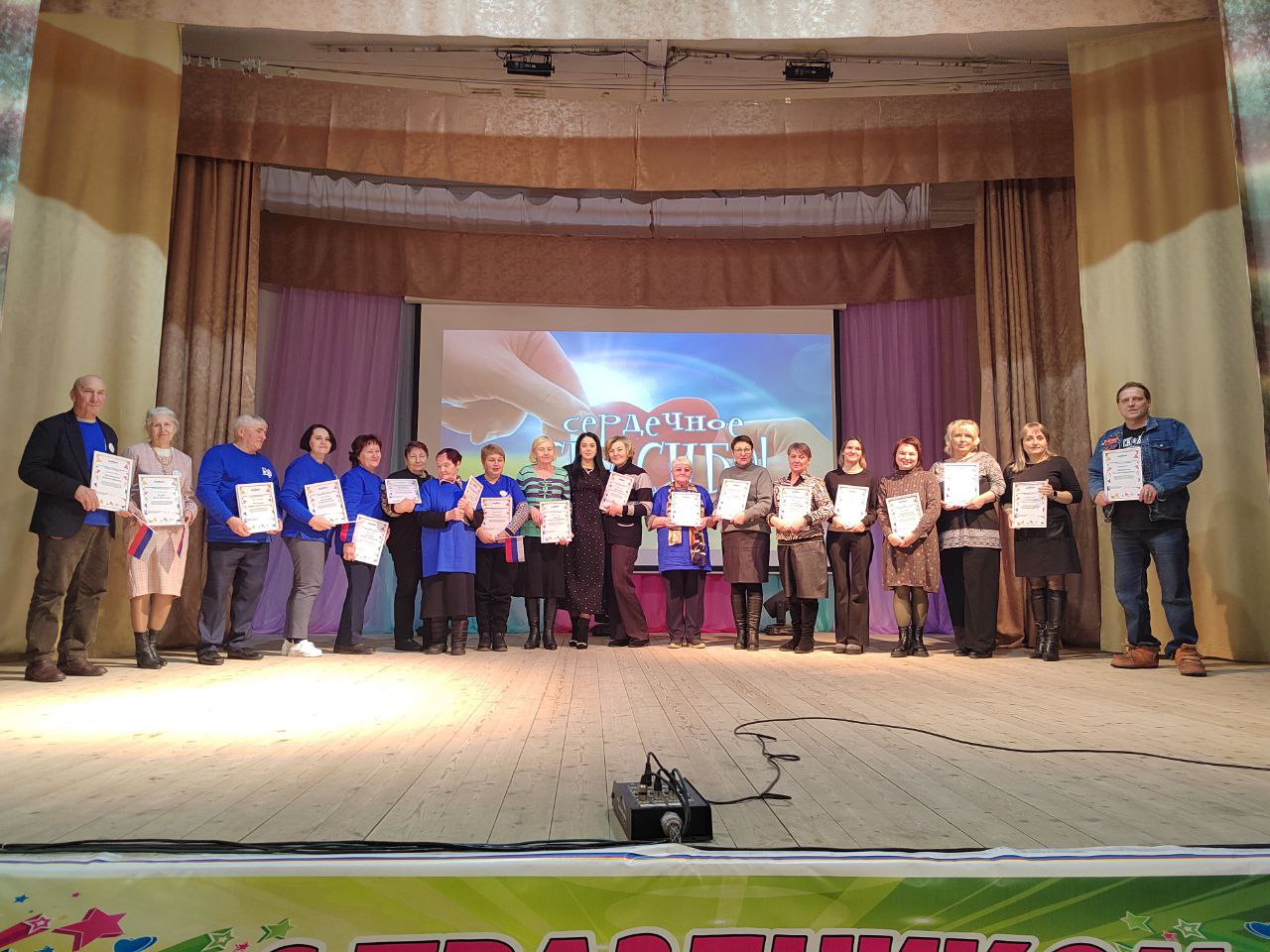 На сцене состоялось торжественное награждение наиболее активных добровольцев, отмеченных за их самоотверженную работу и вклад в жизнь района.